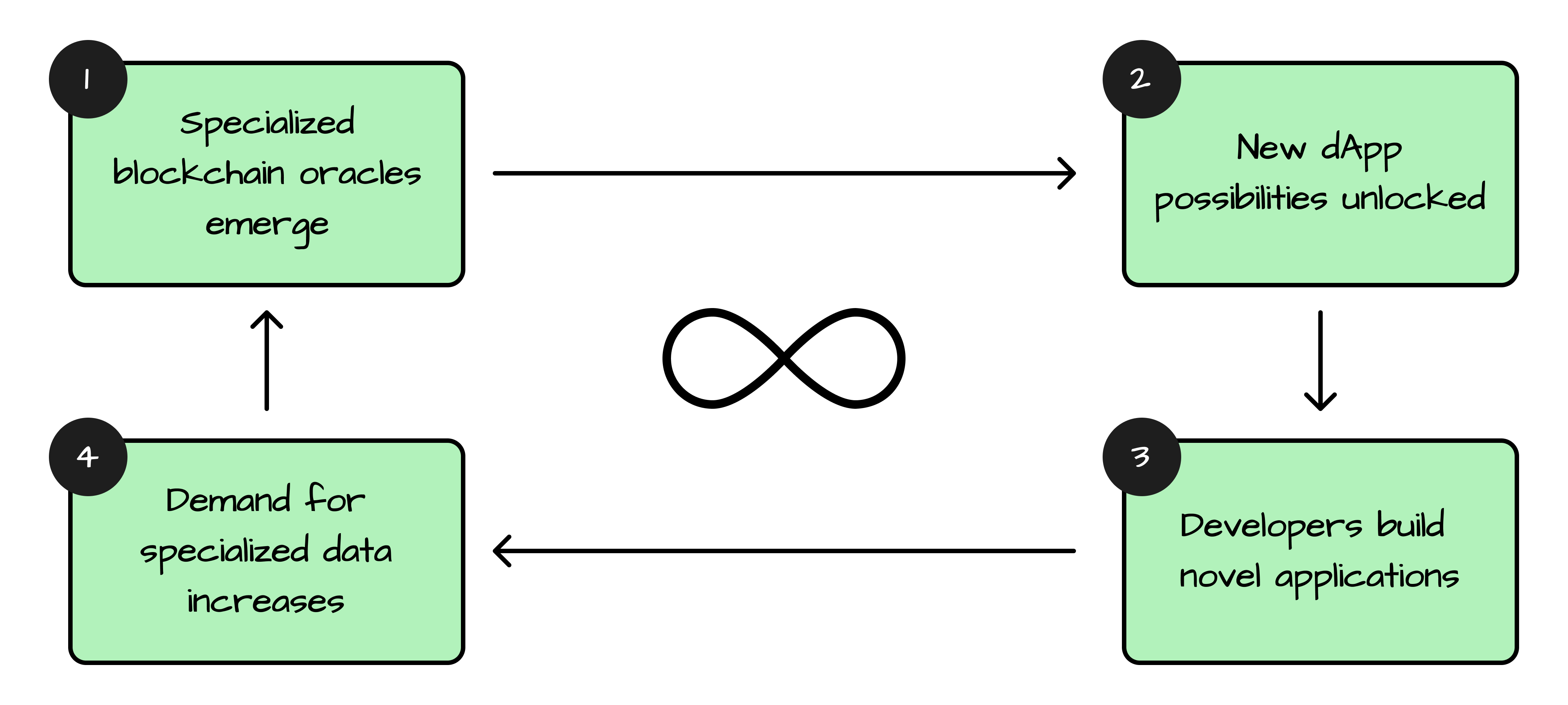 Specialized blockchain oracles emerge —> New dApp possibilities appear —> Developers build novel applications —> Demand for specialized data increases —> More specialized blockchain oracles emerge